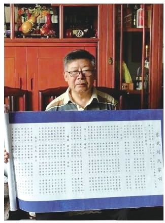 刘哲浩将培养好子孙后代使他们成长成才视为重任,退休后的他将大部分时间用于编写《东武刘氏家训》。以道光年间的一份刘氏老家训为蓝本,他对家乡的风土人情进行走访调查,一边整理编写文字稿件,一边查阅古书补充资料。历经2年时间,《东武刘氏家训》终于完成。“这份家训,既有老祖宗的智慧,也有我多年的人生感悟,还有亲朋好友的意见建议。”刘哲浩对家训的崇尚,无声影响着身边人,滋养了父慈子孝、笙磬同音的家风。
