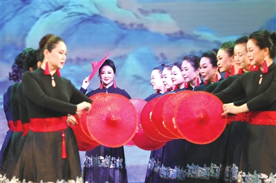 图为青岛市服装表演协会表演模特走秀《山河赋》。