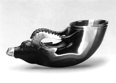 兽嘴处镶金,起到画龙点睛的作用,其实这是酒杯的塞子,取下塞子,酒可以从这儿流出。头上的一对羚羊角呈螺旋状弯曲着与杯身连接,在杯口沿下又恰到好处地装饰有两条圆凸弦,线条流畅自然。这件酒杯材料罕见珍贵,是极其稀有的缠丝玛瑙,材质纹理细腻,层次分明。