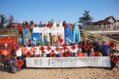 | 民间红色书法家张家荣(前排右五)书写了系列长卷,喜迎北京冬奥会。 |