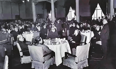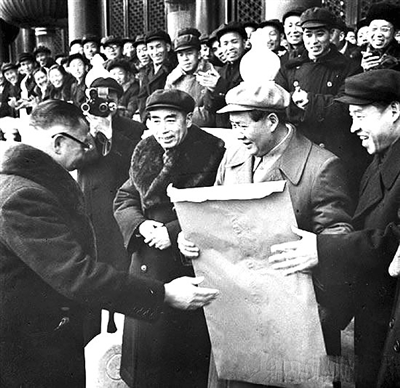 ①1956年1月北京各界庆祝社会主义改造胜利联欢大会上,工商界代表乐松生向毛主席献报喜信。