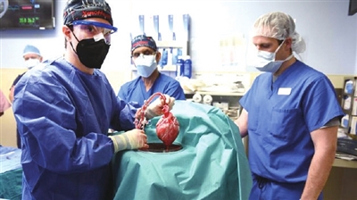 2022年全球首例猪心脏移植手术成为这一探索中的里程碑事件(如图),入选《自然》杂志2022年十大科学新闻。去年1月,美国马里兰大学医学中心为一名男性心脏病人成功手术,将猪的心脏移植入其体内,属全球首例。术后几周,移植心脏运转良好,没有排异反应迹象。尽管这位病人在3月份病情恶化后去世,但科学家认为,这一手术仍为研究人员提供了很有价值的信息。