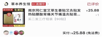 “我这两年,不知道什么原因,手背上边、胳膊,老是感觉发凉,还有点儿痛,特别是晚上睡觉的时候,感觉更严重,我需要一只手抱着一个胳膊,感觉热乎点了也就舒服点儿,不那么痛了。这也不是个办法,后来我跟孩子要了些暖宝宝贴胳膊,热乎乎的挺舒服。暖宝宝用完后,我就想在网上买一些。”秀玉说,她打开拼多多网页一看,什么样的贴都有,都标明能治她的症状,有艾灸贴也有姜贴。“挑来挑去我就花眼了,最后买了一个姜贴。因为它写的产品号称是‘同仁堂’的,我觉得大品牌放心,就选了这款‘同仁堂艾草生姜贴发热贴’专治腰酸背痛关节痛。”