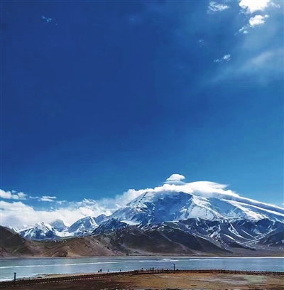 昆仑山连绵起伏,高耸巍峨,雪山峰顶银装素裹,云雾缭绕。我边看边拍摄着,蓝天下的昆仑山脉、雪峰、冰川、云海相互辉映,犹如蕴藏着超越人类的力量。我还看到了从这山或那山的山顶上有一道弯弯曲曲的羊肠小道般的线条顺山而下,在阳光下闪烁着与山体极大反差的光亮,我猜那一定是山泉水,昆仑山的雪在阳光照射下融化了,光灿灿、银闪闪,汇成河流,形成大量的地下水,滋润着一方水土一方人。