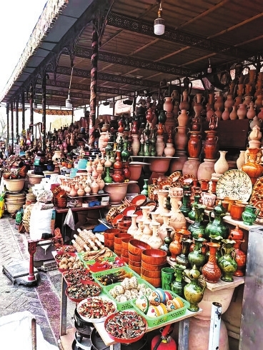 古城门,长号吹起,美丽的维吾尔族男女青年载歌载舞欢迎来自八方的客人。这里的生活气息很浓郁,不仅保持了原有的风貌,还增加了现代管理和商业元素,成为民居、观光、购物、休闲的好地方。纵横交错的街头巷尾,精美的伊斯兰风格建筑,错落的生土色泥墙的土屋,色彩艳丽的拱形门,繁复雕花的窗棂,琳琅满目的西域商品,异国风情的面庞和装束和语言,铁匠铺、打馕店、烤包子铺、民族餐厅,各类手工艺,丝巾、毛毯、陶罐、玉器、等等店铺一家连一家,偶尔一位维吾尔大爷手提满袋子的馕,踩着滑板潇洒地路过,使我们不由感叹古城的古朴和轻松。