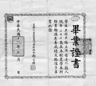 我的祖父王硕臣,字翰卿,直隶(今河北)遵化县南岗村人。生于清光绪二十一年(1895),故于1962年11月,终年六十七岁。祖父在青年求学时期与直隶农务学堂有过不浅的缘分。曾在该校拿到两张毕业证。第一张毕业证即是民国八年(1919)“在本校甲种蚕学本科修业期满考查成绩及格准予毕业”的证书,为蚕科第一班。