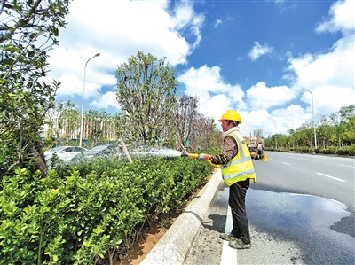 聊天的间隙,陈桂香喝了一支藿香正气水,然后猛灌了一大杯白开水,“藿香正气水是公司发的,干活之前就先喝上一支,防止中暑。为了不脱水,还要多喝水。”陈桂香跟记者补充道。陈桂香熟练地扯下车上的水管,打开开关一边冲着地面一边用手试着水温,“现在温度太高,水管里的水太热,水凉后再浇。”夏顶酷暑对绿化工人来说是家常便饭,然而,她们从未因天气炎热而退缩过。相反,越是高温酷暑她们越要坚守岗位。因为高温天气下,她们不能让绿化树木“中暑”。