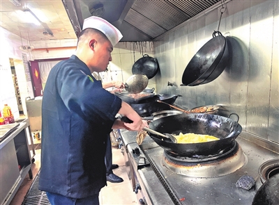 从早上四五点钟到岗,到晚上六七点钟下班,郭超堂一天要忙活十几个小时,由于厨房没有办法安装空调之类的制冷设施,夏天往往是厨师最难熬的季节。“厨房的温度还是比较高的,特别是灶台附近,温度要达到五六十度。”
