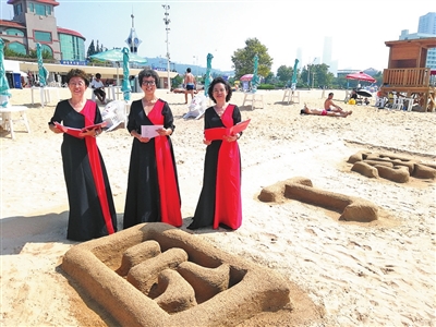 没有音乐,但有海浪的波涛声来伴奏;没有舞台,但有沙子堆成的浮雕书法作品当背景;没有观众,但有来来往往的泳者和游客……9月6日上午,在青岛第一海水浴场,一场独具“青岛特色”的教师节沙滩诗歌朗诵会举行。来自青岛市空中老年大学正阳诗社的三位朗诵爱好者吕永伶、谢丽华、石建荣(从左到右)穿着统一服装朗诵诗歌《园丁颂》。