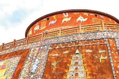 瓷宫位于景德镇市浮梁县新平村的新平公路旁,其外形像一个色彩斑斓的巨大圆形“蛋糕”,建筑物内外墙面也像天津的“瓷房子”一样,贴满了瓷片和瓷器,据说整座建筑用了6万多件瓷器和80吨瓷片,来来往往的车辆经过这里,无一不停车驻足观看。