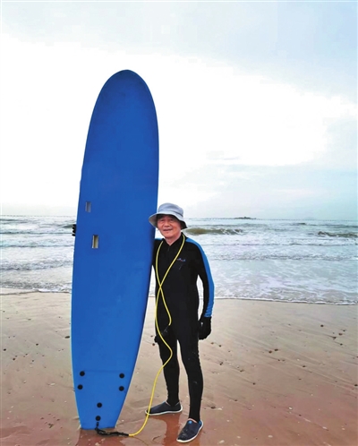 喜欢挑战是孙建民给自己贴的标签,虽然已经年逾古稀,看到新奇的事物他还是产生了尝试的兴趣。“海浪来的时候,三五十米,甚至百米以内,你就得判断这股浪到眼前时会成什么样子,这时滑水就要掌握好早晚、快慢的节奏。”孙建民说,冲浪技能是他看视频自学的,实在弄不明白的地方,再请教年轻人。