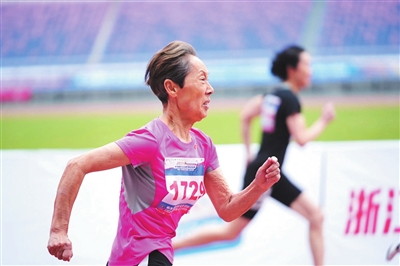 本报杭州讯 近日,中国田径大众达标系列赛总决赛上在杭州黄龙体育中心开赛,比赛项目包括60米、100米、200米等几乎所有田径比赛正式项目。在A50女子组100米决赛中,拿到第一的是来自山东济南的毕耜玲,是一位头发花白,72岁的奶奶选手。