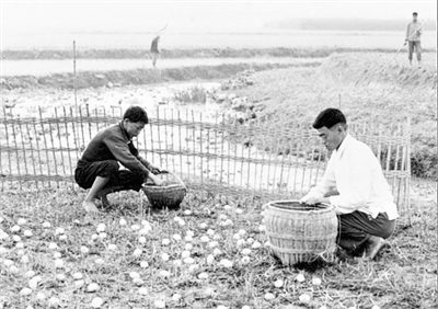 1980年春,河南信阳固始县杨集大队,青年们在收鸭蛋,他们为生产队包放了500多只鸭。家庭联产承包责任制实施后,农村改革浪潮兴起。