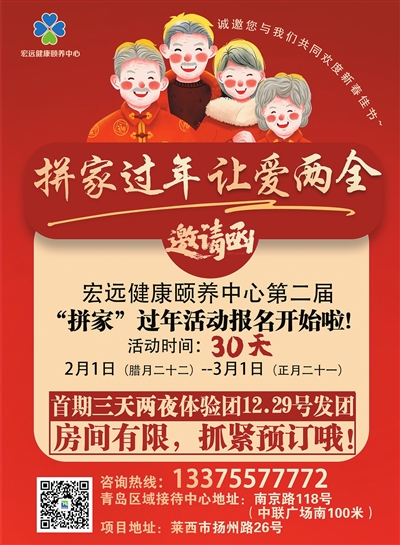 宏远健康颐养中心一经建成,就深受岛城广大长者的喜爱,并于4月份开展“短期康复”和“活力旅居”板块,9月份开展全国旅居板块,目前已入住近千人。为回馈广大岛城长者的支持与厚爱,现推出“暖冬”体验活动,每月低至3000元包吃住,这个冬天让我们温暖您!