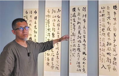 今年56岁的姜平林说,高中时一位同学的启发让他开始对书法产生了兴趣。1987年高中毕业后,尽管投身社会,姜平林从未放弃自我提升,他通过夜校和各类培训班不断充实自我,“我学习了楷书刻印,还涉猎了西画,临摹过四王的画作,我在装饰行业工作过,每次去新工地,总是先找块门板,架起来作为我的夜间创作书桌。”姜平林说。