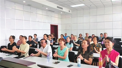 “学好声韵辩四声,阴阳上去要分明……”8月15日,青岛市老年活动中心的211教室里传来阵阵欢笑声,杨光龙老师正带领学员们一起拍打双手练习《四声歌》。当天,市老年活动中心校园开放日免费试听活动举行,杨光龙老师教授的朗诵试听课连同拉丁恰恰、吉他、古琴、油画、山水画、京剧(老生)等十余门课程的公开课受到热捧。数百位老年人踏进教室,尝鲜新学期的新体验。