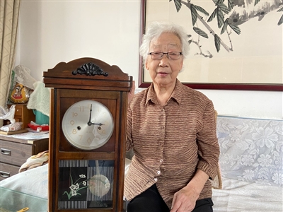 这台挂钟是1970年卫茂松托人购买的,她把它挂在客厅墙上,抬头就能看到时间。“我们每天上班、孩子上学,都看着它确定时间。”卫茂松说,每次看到这台挂钟,都会想起一家人急急忙忙吃早饭、互相提醒着不要忘这忘那的情景。“时间过得真快,一转眼孩子们都长大成家,老伴也去世几年了。”卫茂松的眼神里闪过一丝哀伤,“等我走了以后,儿女们不一定喜欢它,把它捐给博物馆挺好的。”