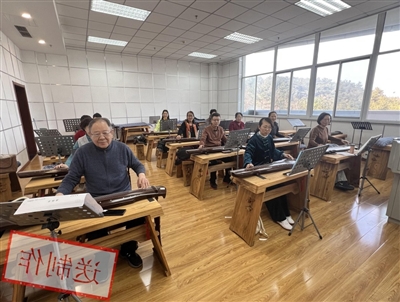 在中国传统文化中,琴棋书画并称为“四艺”,历来被视为文人雅士修身养性的必由之径。古琴对古人来说,不但是乐器,也是抒怀寄情之物。在青岛市老年活动中心24级古琴一年级1班的课堂上,一曲《仙翁操》悠扬响起,赵涛老师正带领着老年学员们演奏古琴。