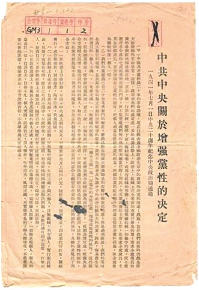 1941年7月1日中央政治局通过的《中共中央关于增强党性的决定》(以下称《决定》),是中国共产党历史上第一个也是迄今为止唯一一个以增强党性为主题、直接以党性命名的中央文件。
