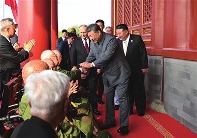 据新华社消息,9月3日,纪念中国人民抗日战争暨世界反法西斯战争胜利80周年大会在北京天安门广场隆重举行。大会开始前,中共中央总书记、国家主席、中央军委主席习近平同抗战老战士老同志代表亲切握手,向他们表示崇高敬意(左图)。