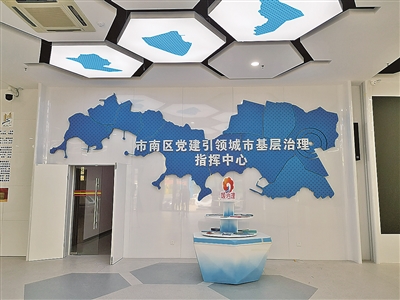 ■市南区推进区域治理“一网统管”,构建区域联动、感知统筹、数据共享、业务融合的城市云脑赋能体系。图为市南区党建引领城市基层治理指挥中心外景。
