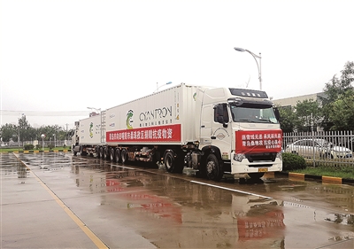 ■8月11日上午10时,两辆满载防疫物资的集装箱运输车从上海医药控股青岛物流中心驶出,开始前往西藏日喀则桑珠孜区的行程。8月份,西藏日喀则桑珠孜区新冠病毒疫情突然暴发,防疫物资紧缺。青岛市第十批援藏干部主动下沉日喀则抗疫一线对接需求,青岛市疫情防控指挥部连夜组织准备紧缺的物资货源。图为装载着200万元防疫物资的集装箱运输车从青岛出发。 王 涛 摄影报道