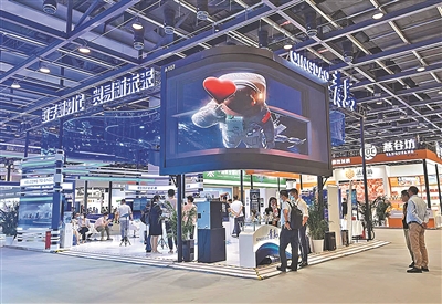 记者在现场看到,青岛展区风格简约明亮,整体宛如蓝色动感的波浪,寓意引领“青岛服务”走向深蓝。据介绍,整个展区采用绿色环保、低碳可回收材料,结合裸眼3D、交互设备、体验设备等科技创新展现形式,突出沉浸式观展体验。今夏点亮青岛百年中山路的裸眼3D大屏也按比例复制到了服贸会现场,吸引了诸多参观者驻足。