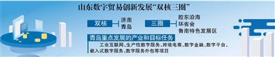 山东数字贸易创新发展“双核三圈” 双核 济南 青岛 三圈 胶东沿海 环省会 鲁南特色发展区 青岛重点发展的产业和目标任务 工业互联网、生产性数字服务、跨境电商、数字金融、数字平台、嵌入式数字服务、数字服务外包等项目