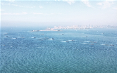 ■9月1日,为期4个月的黄渤海区伏季休渔期正式结束。青岛3453艘应休渔船奔赴大海。图为中午12点,大批渔船从胶州湾鱼贯而出。(无人机照片) 韩 星 摄