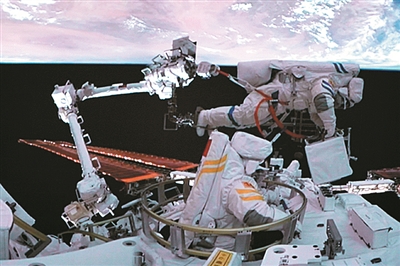 ■9月1日在北京航天飞行控制中心拍摄的航天员陈冬(上)、刘洋(下)开展舱外操作的画面。 新华社照片
