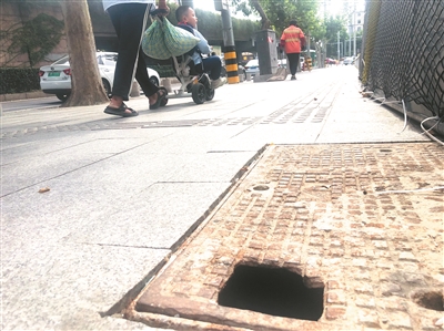 ■重庆南路悦荟商场附近人行道上的破损井盖长期无人维修。