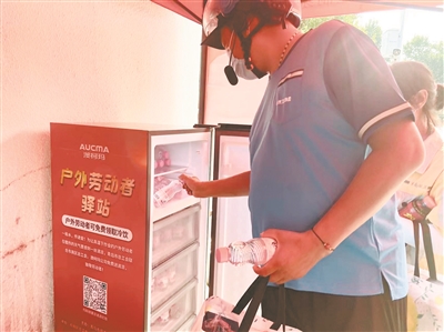 ⑤户外劳动者到工会摆放在驿站的冷柜前领取免费冷饮。