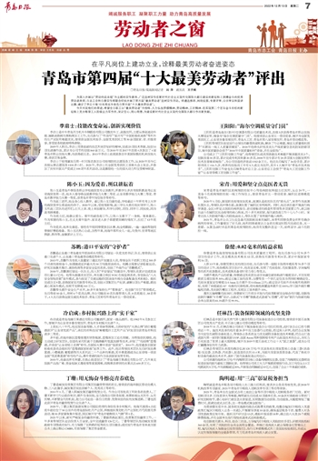 为深入开展以“劳动创造幸福”为主题的宣传教育,广泛选树宣传在新时代社会主义现代化国际大都市建设的新征程上拼搏奋斗的优秀劳动者典型,市总工会和市委宣传部联合组织开展了第四届“最美劳动者”选树宣传活动。经遴选推荐、网络投票、专家评审、公示审议和演讲比赛,确定了李启士等10名同志为青岛市第四届“十大最美劳动者”。