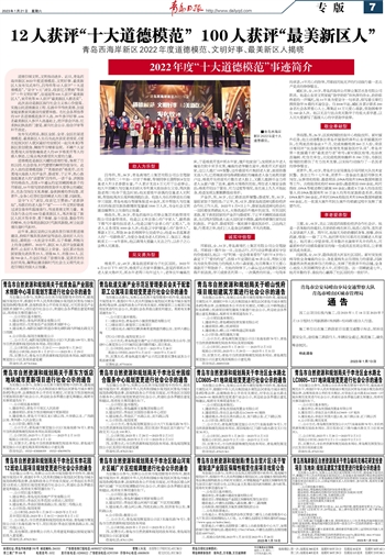 道德引领文明,文明推动进步。近日,青岛西海岸新区2022年度道德模范、文明好事、最美新区人发布仪式举行,吕传伟等12人获评“十大道德模范”,“坚守‘1元’诚信,收获亿万赞扬”等获评“十件文明好事”,张瑶瑶等100人获评“最美新区人”,宋芹亮等30人获评“最美新区人提名奖”。