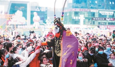 ■市民在四川省泸州市江阳区华阳街道世纪城文化广场观看川剧绝活“变脸”表演(1月25日摄)。 新华社照片