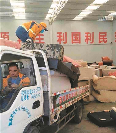 4月7日上午9:30,崂山区康城小区的保洁主管陈美利来到小区2号楼旁边的大件垃圾暂存点,查看垃圾存储情况。当看到暂存点上有了一张床、一组沙发、三个衣柜以及4把凳子后,陈美利拨通了青岛市乐天弘环卫园林工程有限公司大件垃圾回收员的电话。20分钟后,回收员就到达小区,将这些大件垃圾搬运到小货车上,拉回位于崂山区九水东路的大件垃圾处置厂。