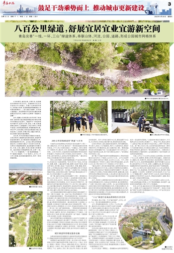 近年来,作为典型海滨丘陵城市的青岛,正充分利用山海城相连的独特优势,多措并举促进绿色增长,全力推进城市绿道建设工作,建成绿道800余公里。去年起,青岛还将绿道建设列入公园城市建设三年攻坚行动任务。完善全市绿道系统规划,通过绿道充分串联山体、河流、公园、道路,形成公园城市网格体系。重点实施3项绿道骨架工程,完善“一线、一环、三山”绿道体系,“一线”指滨海绿道,“一环”指城区绿道环,“三山”指浮山、太平山、午山环山绿道,逐步建成蓝绿交织、内外一体的绿道系统。