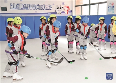 ■青岛基隆路小学学生在学校冰场学习冰球运动。