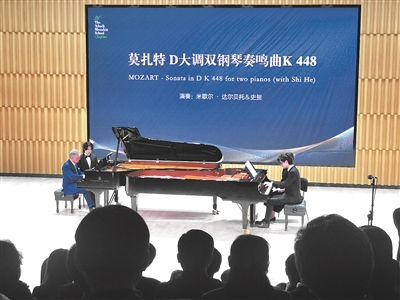 本报5月10日讯 10日晚间,法国国宝级钢琴家米歇尔·达尔贝托钢琴独奏会在青岛耶胡迪梅纽因学校举行。作为该校钢琴教授,米歇尔·达尔贝托为自己的首次青岛独奏会精心设计曲目,现场演奏了李斯特的《野趣》、德彪西的《意象》、拉威尔的《夜之幽灵》和莫扎特的《D大调双钢琴奏鸣曲》四部经典,让学子们大饱耳福。