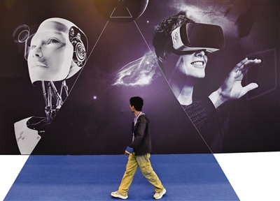 ■“未来已来”,一名观众从颇具科技感的海报前走过。