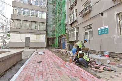 ■人民路235号老旧楼院正在铺设新地面。崔冬妮 摄