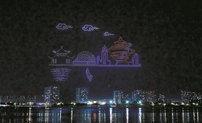 ■8月23日晚,2023年中国网络视听精品创作峰会特色活动之一的无人机灯光秀表演在东方影都星光岛上演。 王 雷 摄