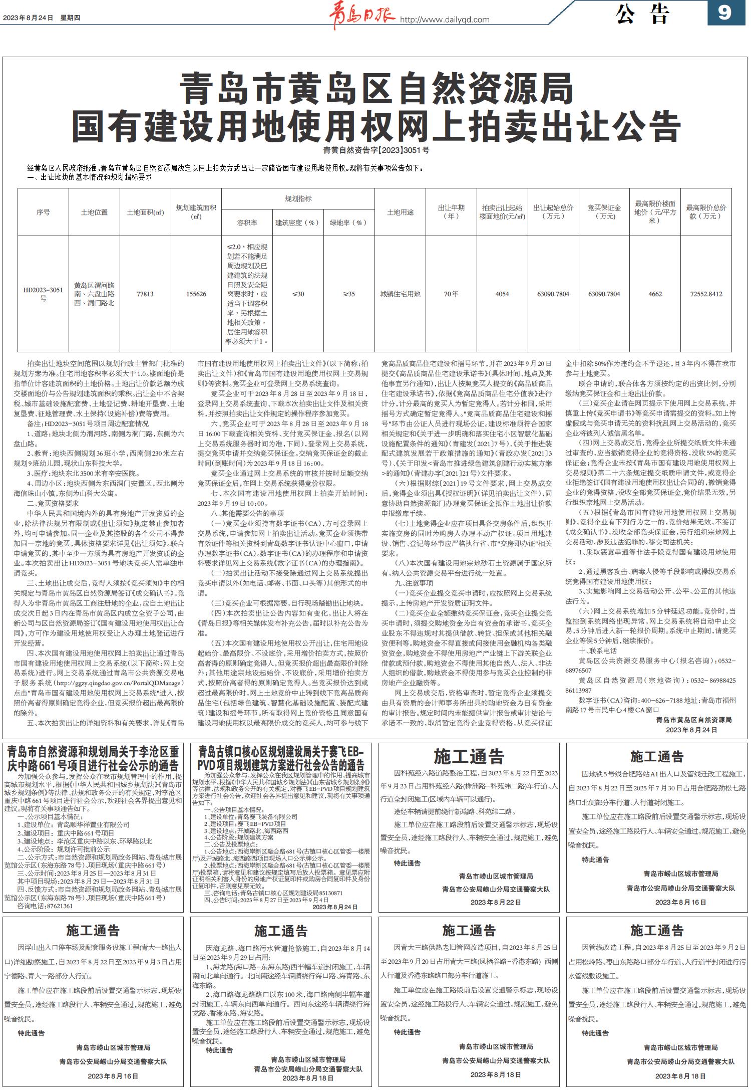 青岛市黄岛区自然资源局国有建设用地使用权网上拍卖出让公告
