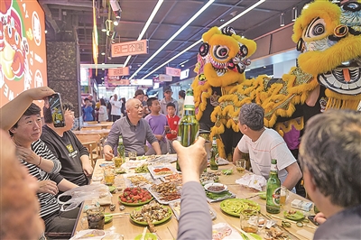 ■①浮山所农贸市场内,市民在聚餐。 梁 喻 摄