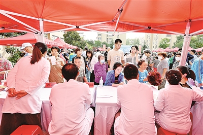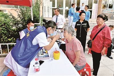 ■山东第一医科大学附属青岛眼科医院公益服务队为居民做眼部健康检查。
