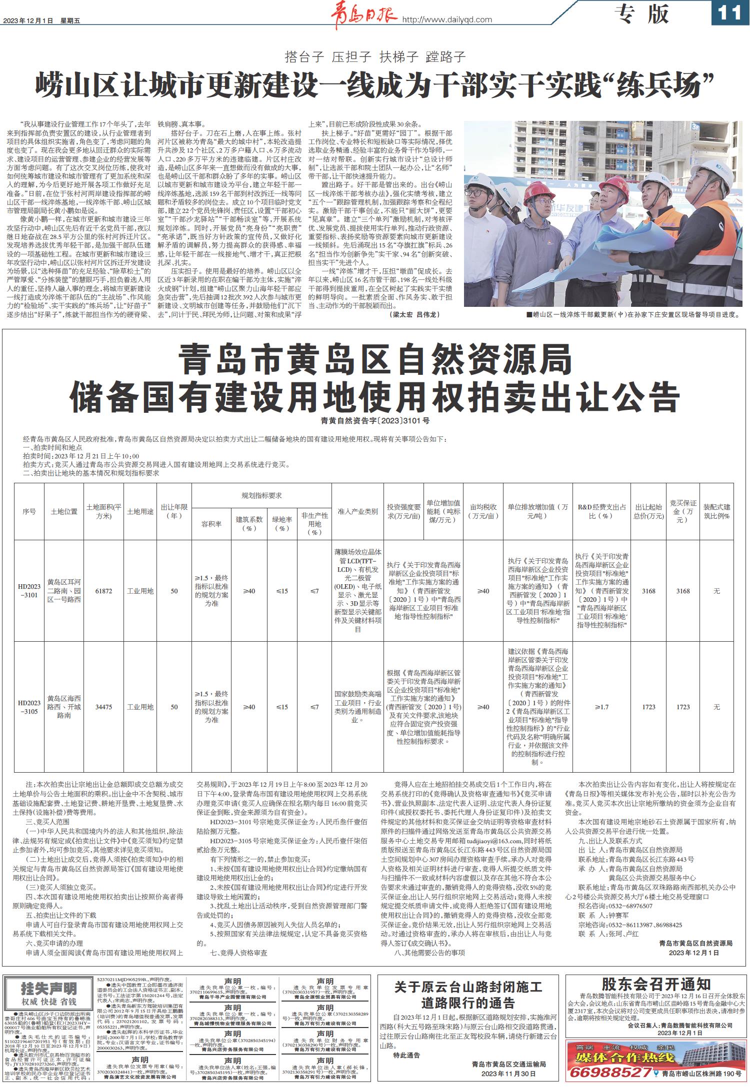 青岛市黄岛区自然资源局储备国有建设用地使用权拍卖出让公告