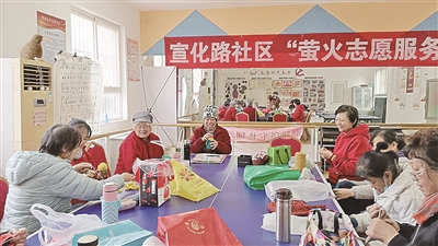 宣化路社区有4000余家住户、8000余名居民,60岁以上老年人占数近半,老年人这一弱势群体成为宣化路社区党委关注、帮扶的对象。令人欣喜的是,如今,魏君岱所在的“萤火”志愿服务社已成为100多名志愿者共同的家,这些“萤火虫们”是社区的老党员、楼院的老邻居。“我们根据志愿者的特长,把他们编入平安建设服务队、护老服务队、便民服务队三支队伍。一方面,部分老年人的日常生活需要照顾;另一方面,部分老年人对精神文化的需求较多,邻里情编织、巧手剪纸、老年乐书法、护老理发等各种活动都常态化开展,所以服务社的工作繁忙。”宣化路社区党委书记王秀英说。