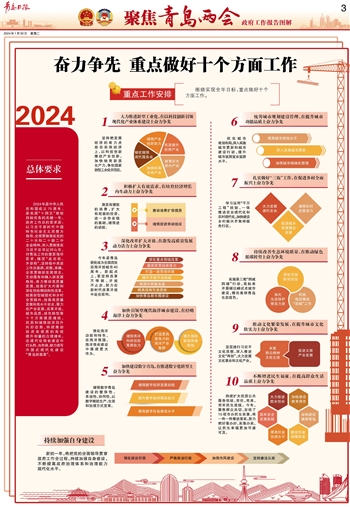 2024年是中华人民共和国成立75周年,是实现“十四五”规划目标任务的关键一年。政府工作总的要求是:以习近平新时代中国特色社会主义思想为指导,全面贯彻落实党的二十大和二十届二中全会精神,深入贯彻落实习近平总书记对山东、对青岛工作的重要指示要求,锚定“走在前、开新局”,坚持稳中求进工作总基调,完整、准确、全面贯彻新发展理念,主动服务和融入新发展格局,着力推动高质量发展,统筹扩大内需和深化供给侧结构性改革,统筹新型城镇化和乡村全面振兴,统筹高质量发展和高水平安全,聚力在产业发展、改革开放、城市品质、绿色转型等十个方面提质增效,巩固和增强经济回升向好态势,持续推动经济实现质的有效提升和量的合理增长,在现代化强省建设中打头阵、当先锋,奋力谱写中国式现代化建设“青岛新篇章”。