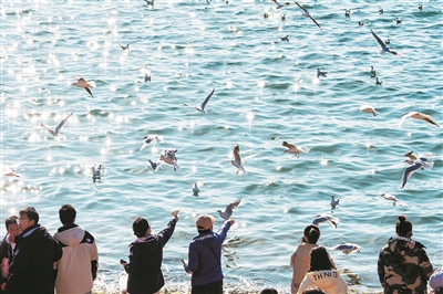 ■人鸥和谐“共舞”成为一道靓丽的风景线。 于 滈 摄