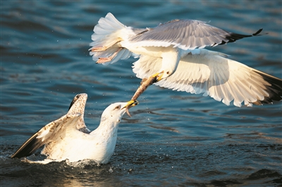 ■两只海鸥在栈桥附近的海面上捕食。 张建华摄于2015年3月